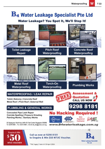 Waterprooifng W P.33 Enquire & Win $ 50 Call us now at 9298 8181 to Enquire & Win $50 NTUC Voucher. NTUC VOUCHER Water Leakage Specialist Pte Ltd *T&C Apply | Valid till 30 April 2024.